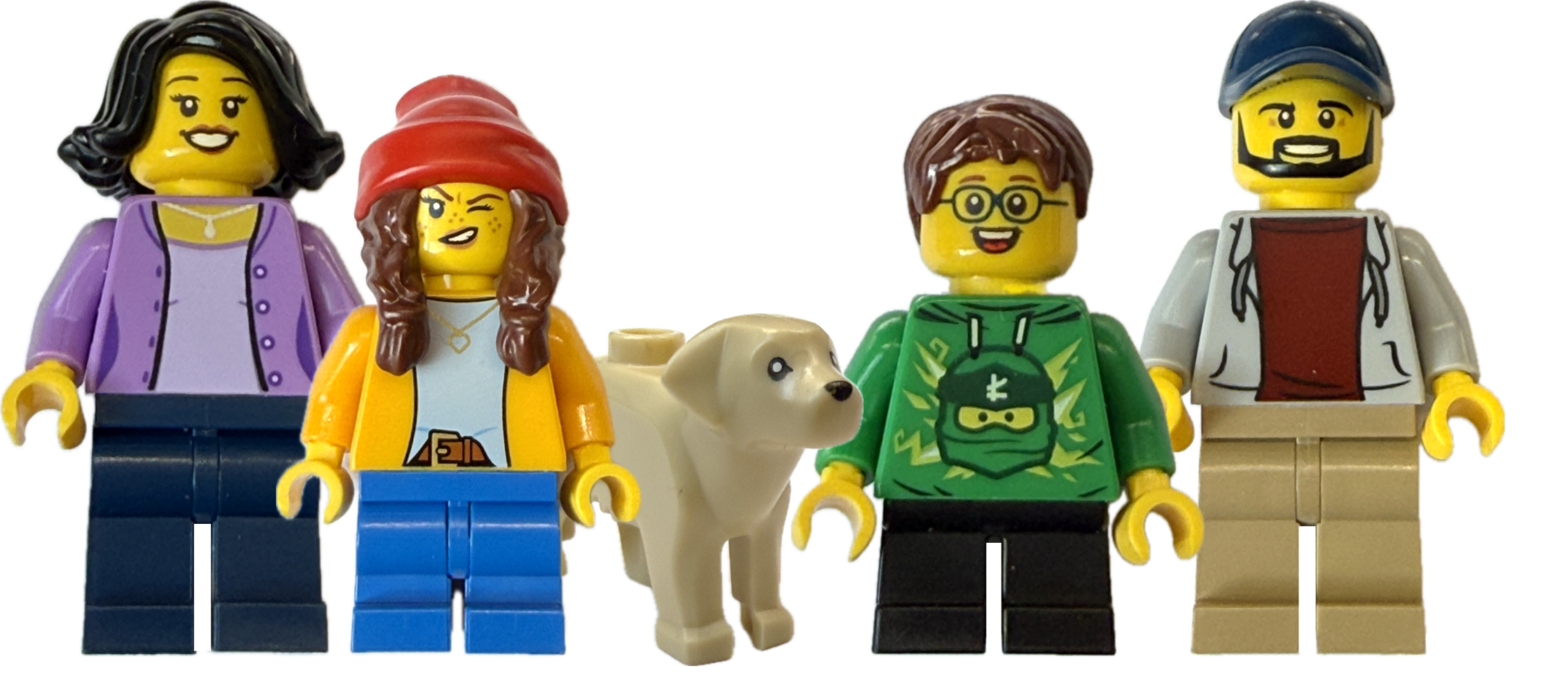 Das Set besteht aus zwei erwachsenen Figuren, einem Jungen, einem Mädchen sowie einem Hund. Die Mutter trägt einen lila Cardigan über einem hellen Oberteil mit dunklen Beinen. Das Mädchen ist mit roter Mütze, gelber Jacke und blauem Beinkleid ausgestattet. Der Junge trägt einen grünen Hoodie mit Motiv und schwarze Beine, ergänzt durch eine Brille. Der Vater erscheint mit Basecap, grauer Kapuzenjacke und beigen Beinen. Die unterschiedlichen Gesichtsausdrücke – von freundlich lächelnd bis zwinkernd – sorgen für lebendige Stadtszenen. Der Hund ergänzt das Familienbild ideal.